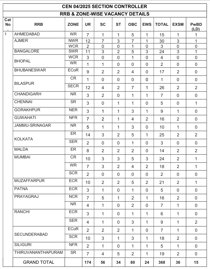 RRB Section Controller Recruitment 2025 : Vacancy Details |